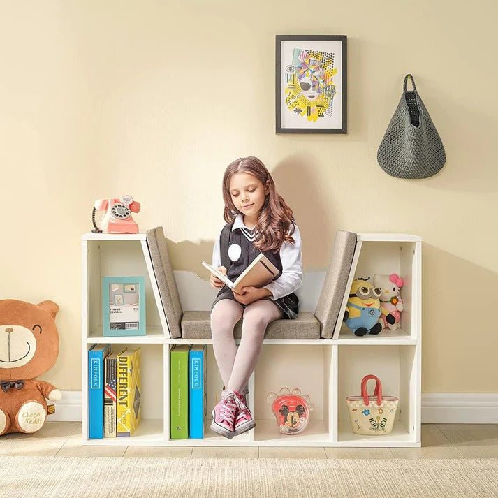 Veliki kapacitet: Šest otvorenih pregrada za odlaganje knjiga, igračaka, cipela i ukrasa. Dve gornje drvene police omogućavaju dodatni prostor za lampu ili sat.