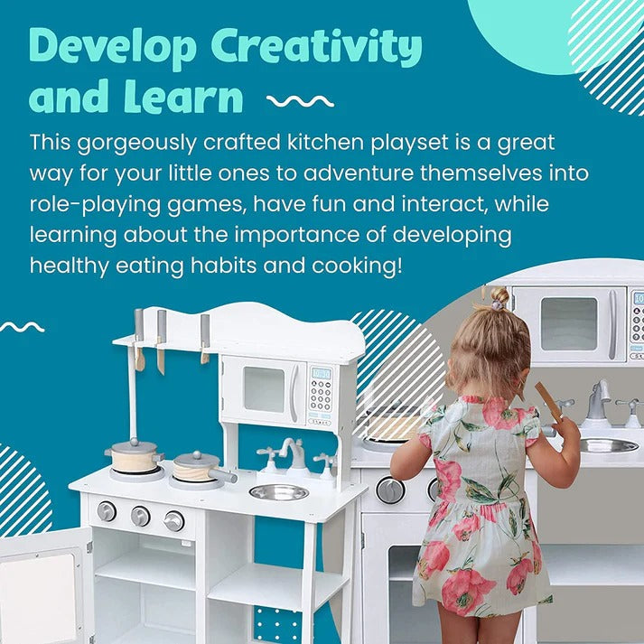 Širina drvene kuhinje, kao i brojni elementi poput vrata koja se otvaraju i rotirajućih dugmadi, omogućavaju djeci da se igraju zajedno s prijateljima. Na taj način lakše usvajaju pravila sigurnog i higijenskog rada. Igra uloga pozitivno utiče na razvoj manuelnih vještina i koordinaciju.