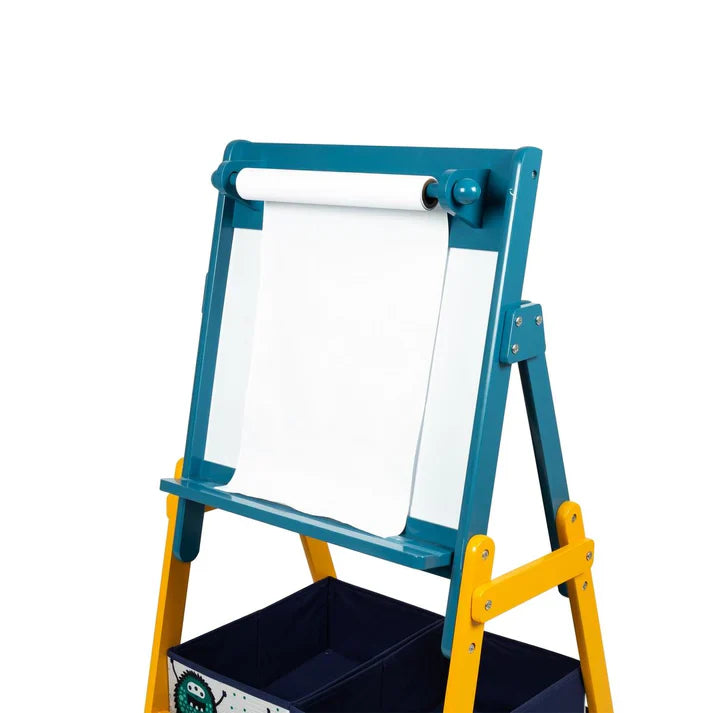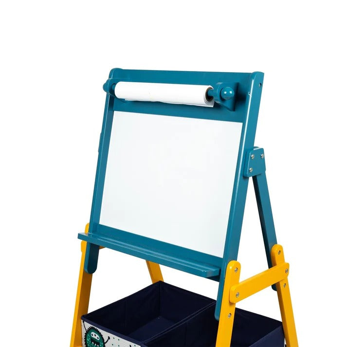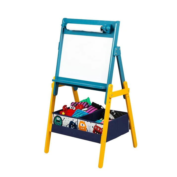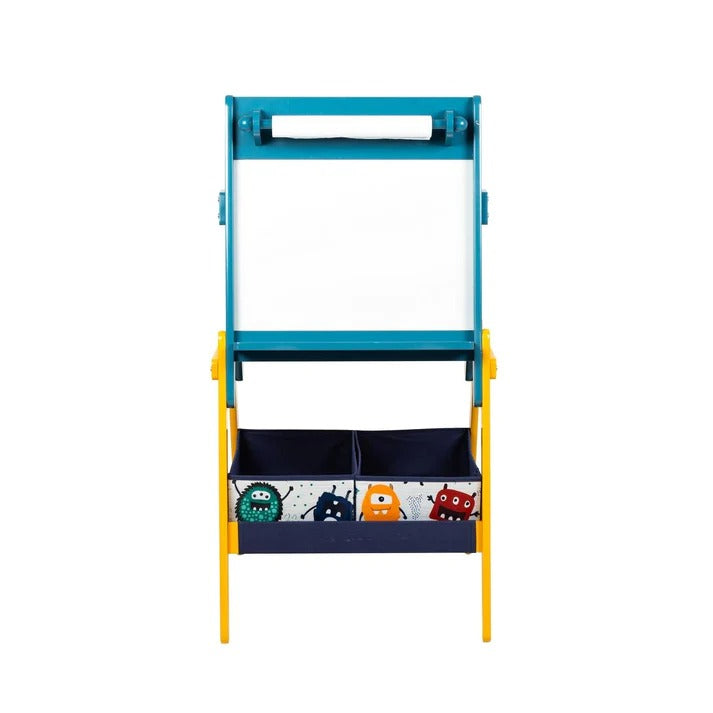 Set sadrži: 2 kom. platnena sanduka za skladištenje, tabla s rolnom papira za crtanje i 26 magnetnih slova. Ima zabavan dizajn sa slatkim duhovima u žutoj i plavoj boji.