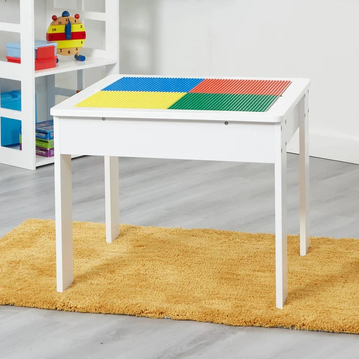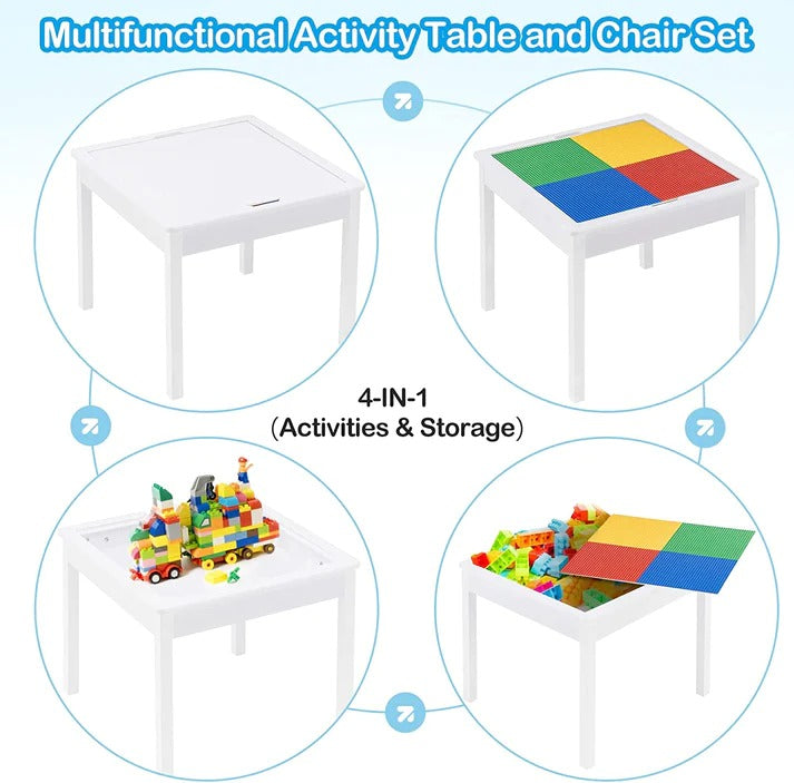 Dizajniran posebno za decu, ovaj visokokvalitetni set ima bezopasni lak koji sprečava ogrebotine i olakšava čišćenje. Sto poseduje ploču sa postoljem za slaganje konstrukcija tipa LEGO i kontejner za odlaganje delova ispod. Ploča stola ima dve funkcionalne strane, a gornja glatka površina pogodna je za crtanje i druge aktivnosti.