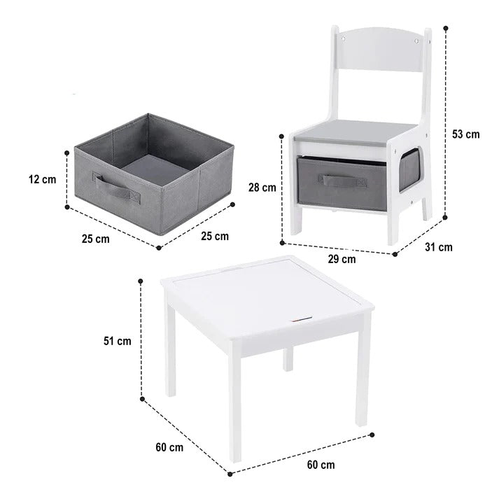 Mališani mogu zajedno sa prijateljima stvarati zanate, čitati, crtati, igrati se i jesti. Set je jak i lagan, lako se premesta iz sobe u sobu, omogućavajući detetu da bude bliže roditeljima. Moderni, čisti dizajn u beloj i sivoj boji uklapa se u svaku dečiju sobu.