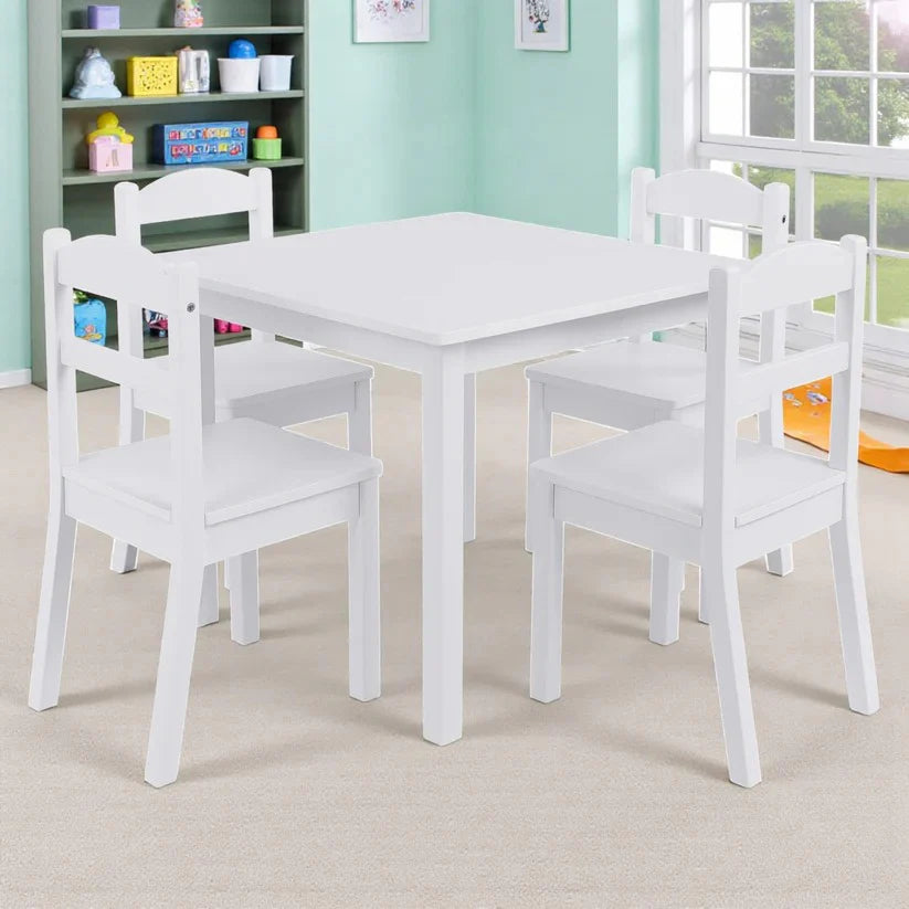 Dječiji sto i 4 stolice su izrađeni od čvrstog punog drveta, otpornog na habanje i lako za čišćenje. Univerzalna bijela boja seta čini ga pogodnim za svaki enterijer – za dječake i djevojčice. Ovaj set je namijenjen djeci uzrasta od 2 do 7 godina i nudi idealnu visinu za udobno korištenje.